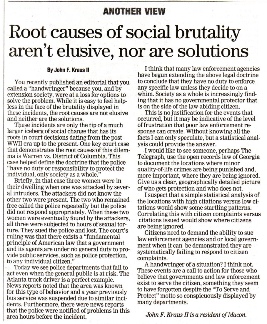 Therefore, I challenge the Macon Telegraph to use the open records law of Georgia (OCGA 50-18-70 G) to document the locations where minor quality of life crimes are being enforced and, more importantly, where they are being ignored. Give us a clear geographically detailed picture of who gets protection and who does not. I suspect that a simple statistical analysis of the locations with high citations vs. low citations would show some startling patterns. Correlating this with citizen complaints vs. citations issued will quickly show where citizens are being ignored.
